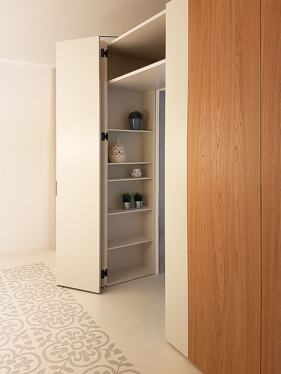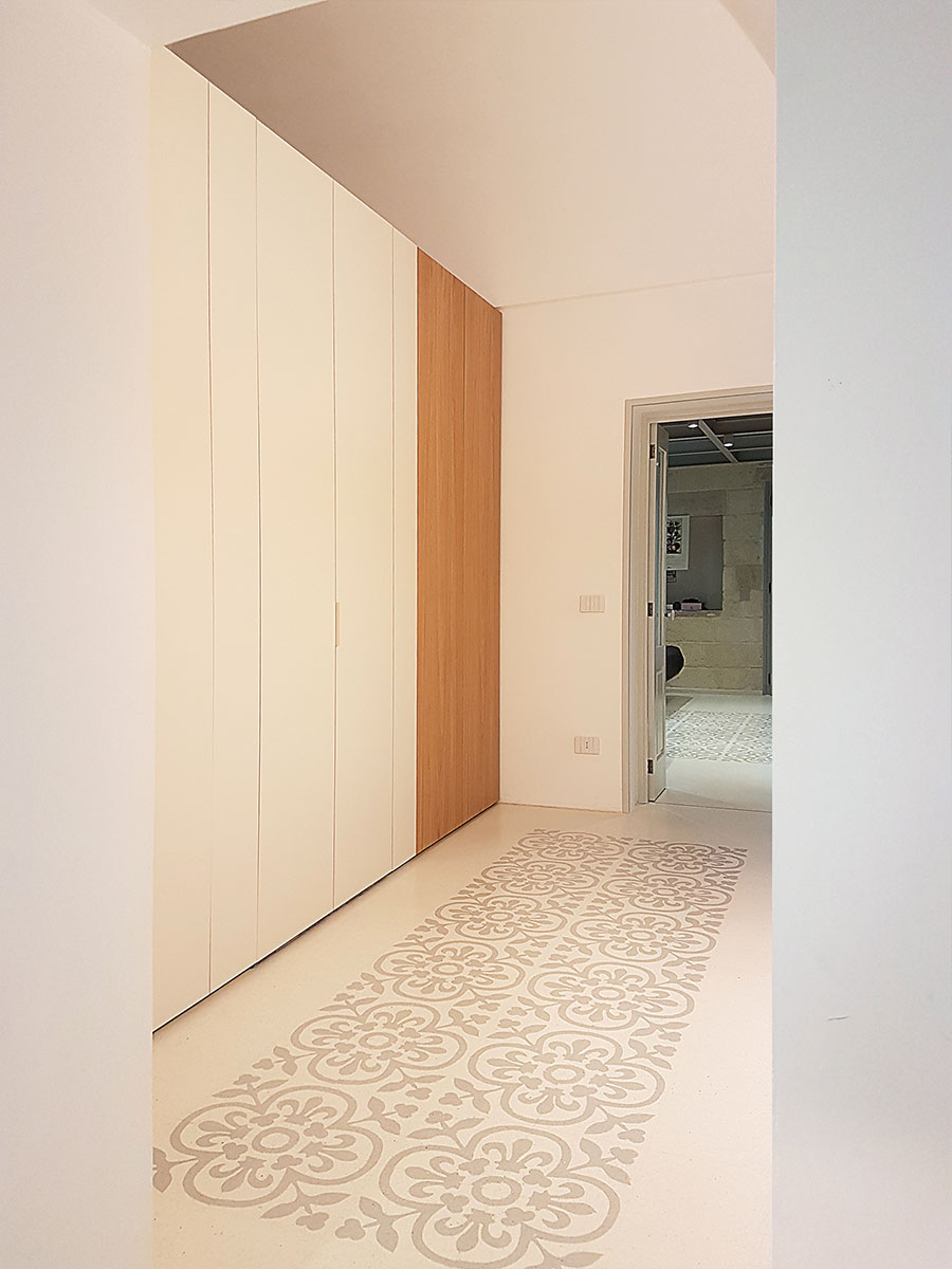 Una zona di passaggio polifunzionale che garantisce contenimento e privacy. Un armadio, all’apparenza semplice, nasconde tra le ante lo speciale modulo passaggio-porta che, attrezzato con illuminazione led e ripiani laterali, separa il bagno dal disimpegno. Le finiture laccato opaco gesso e rovere naturale si legano perfettamente con la pietra leccese e il pavimento in graniglia di questa storica abitazione salentina.