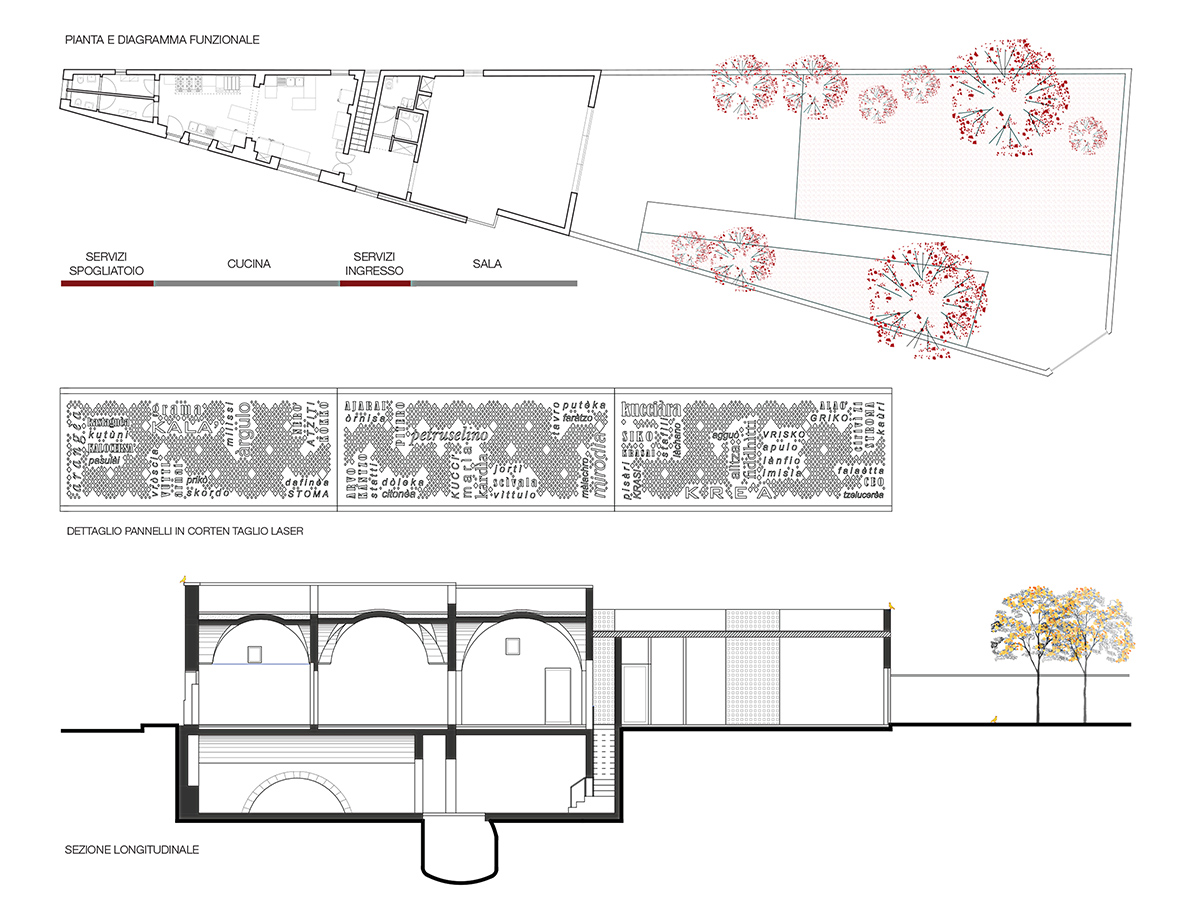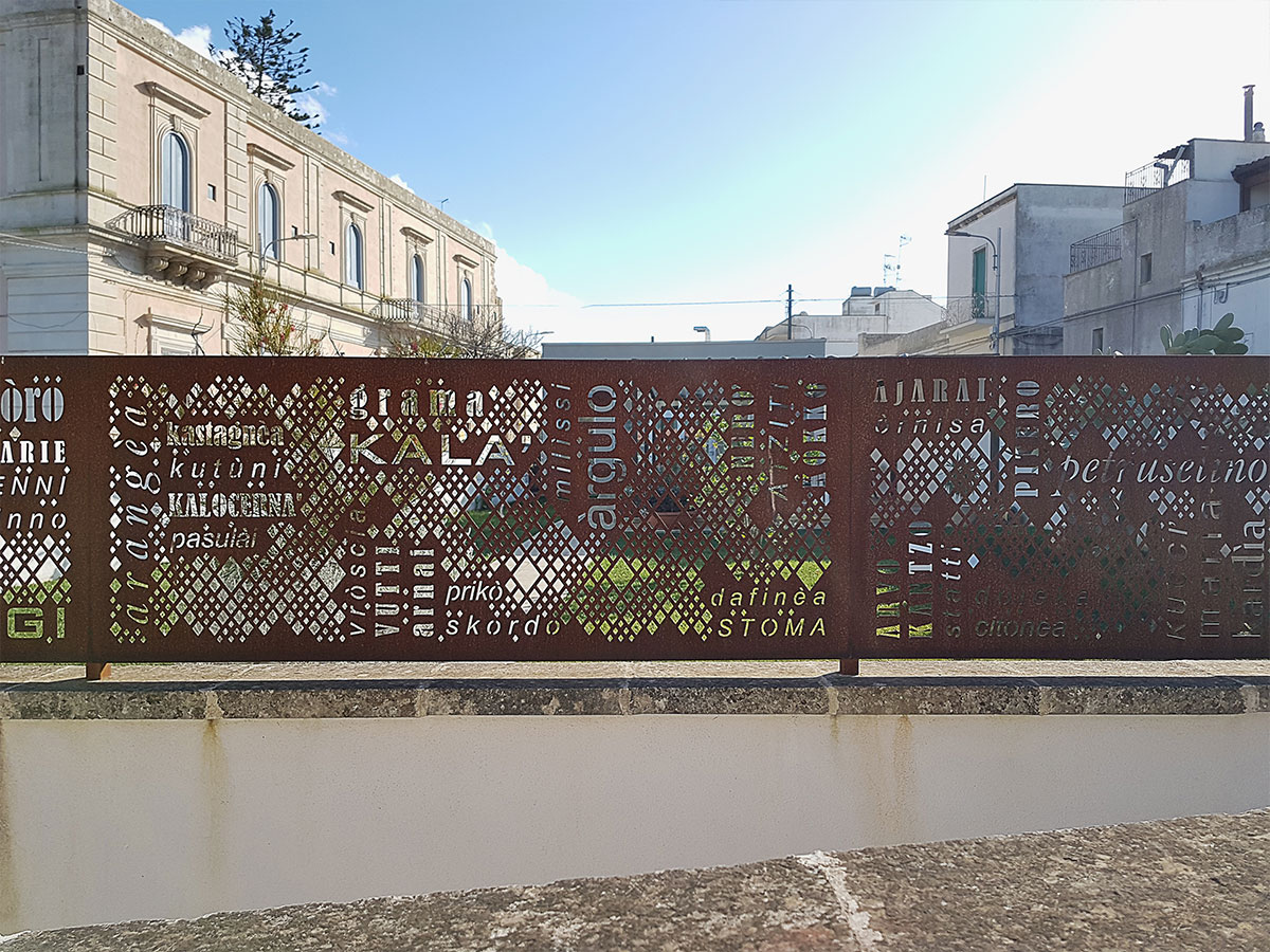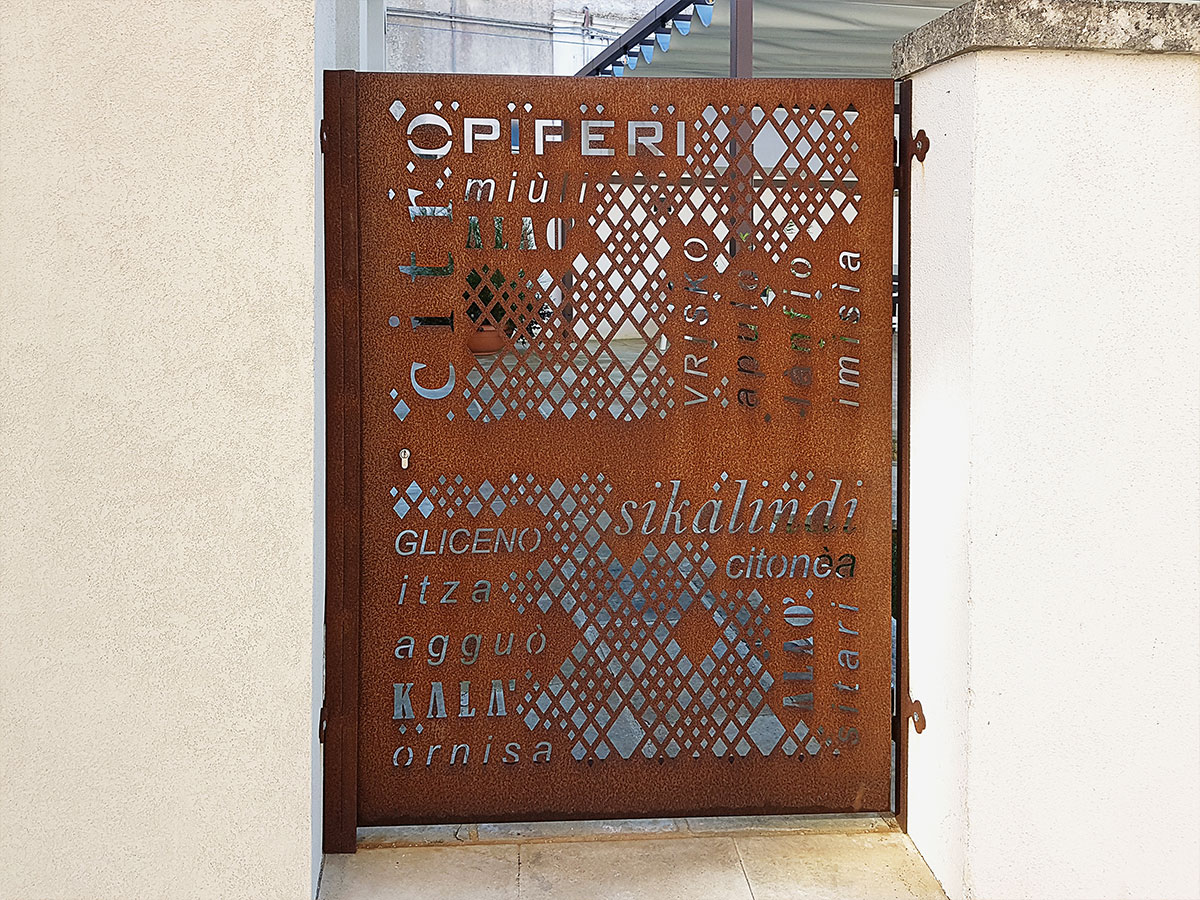 Abbiamo scelto il corten grezzo e selezionato oltre 100 vocaboli nel Griko dei nostri nonni per progettare la texture della recinzione esterna e l’insegna luminosa. Corten utilizzato anche per caratterizzare gli arredi come la libreria del vino, le mensole e l’appendiabiti a parete “Family” tagliato a mano. La sala è completata da sospensioni modello coupola led doppia finitura oro e bicolore, tavoli modulari e poltroncine impilabili per uso indoor/outdoor