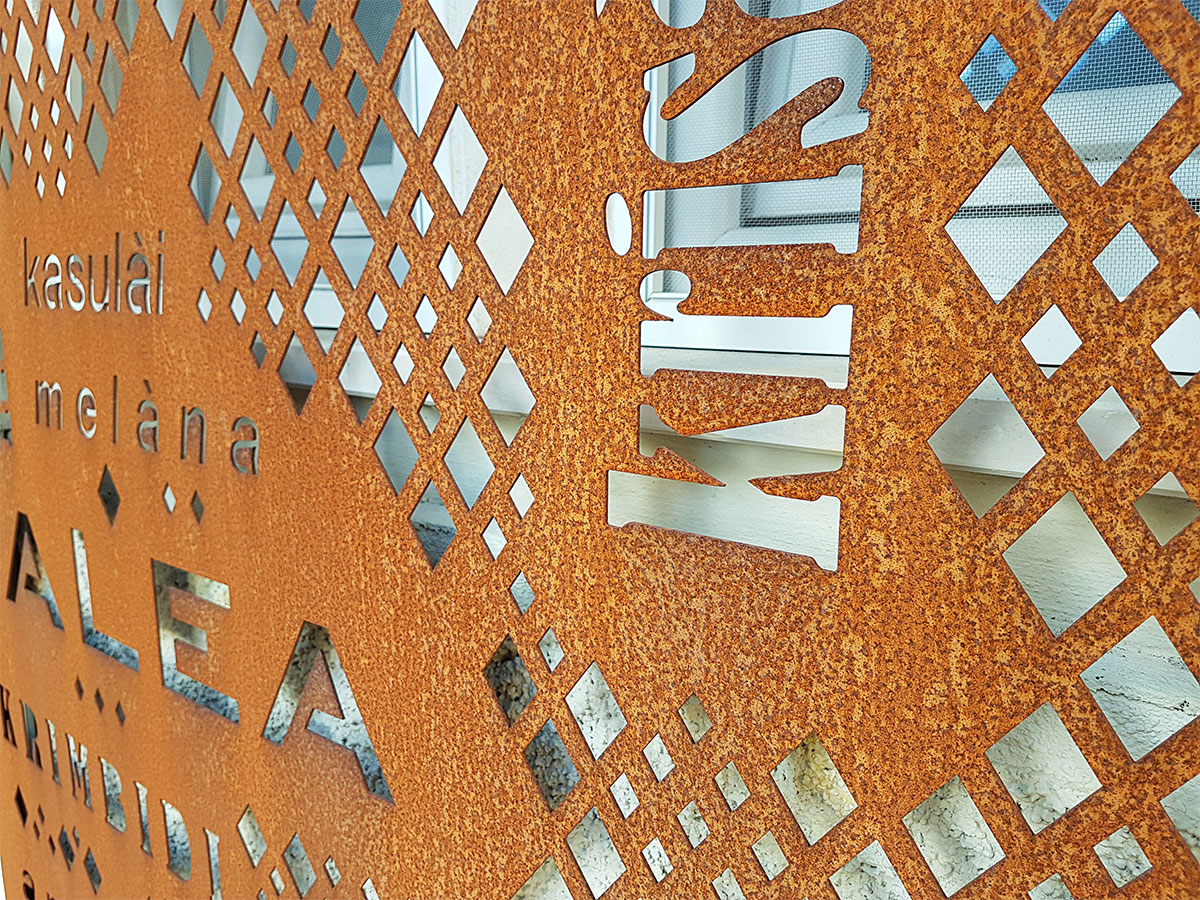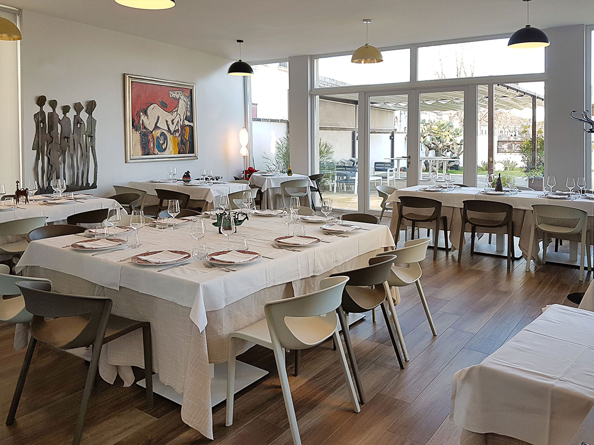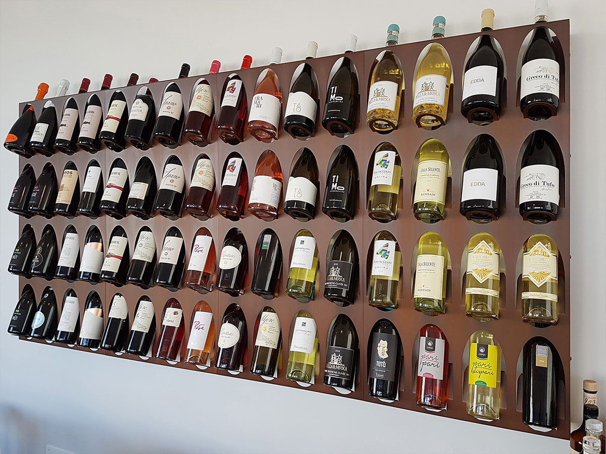 Abbiamo scelto il corten grezzo e selezionato oltre 100 vocaboli nel Griko dei nostri nonni per progettare la texture della recinzione esterna e l’insegna luminosa. Corten utilizzato anche per caratterizzare gli arredi come la libreria del vino, le mensole e l’appendiabiti a parete “Family” tagliato a mano. La sala è completata da sospensioni modello coupola led doppia finitura oro e bicolore, tavoli modulari e poltroncine impilabili per uso indoor/outdoor